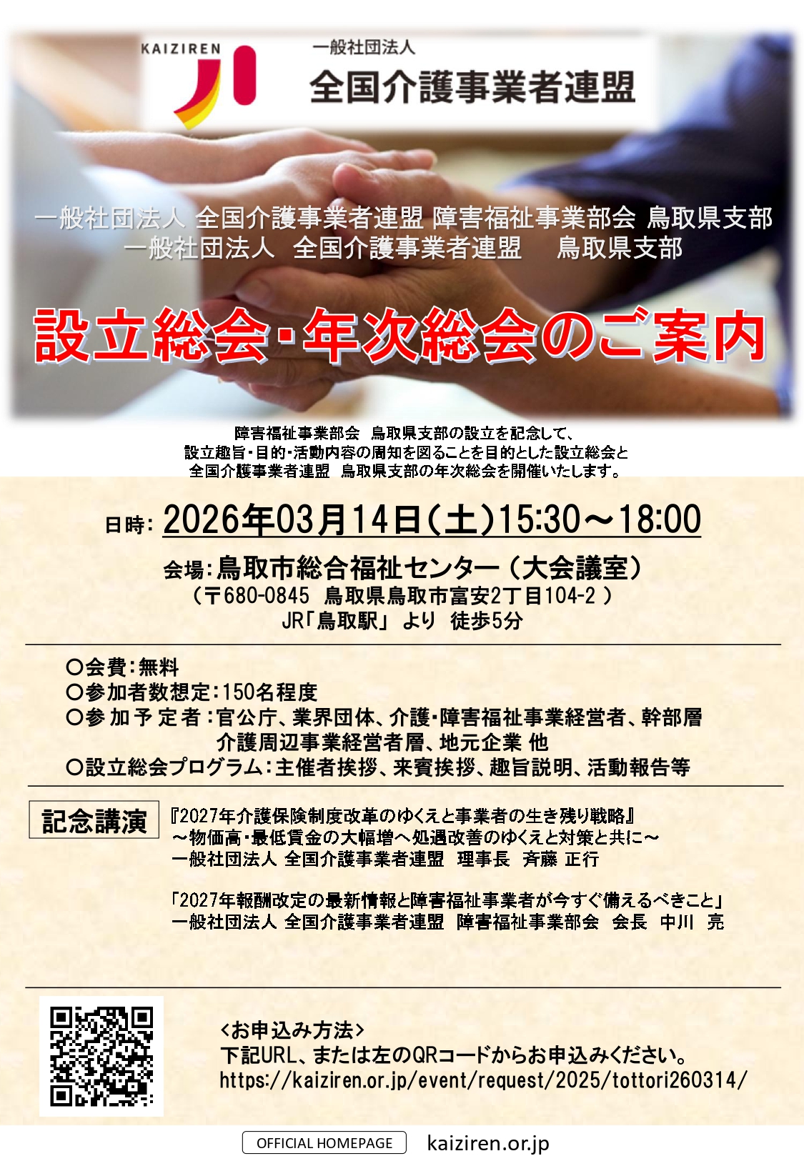 障害福祉事業部会 鳥取県支部の設立を記念して、設立趣旨・目的・活動内容の周知を図ることを目的とした設立総会と全国介護事業者連盟 鳥取県支部の年次総会を開催いたします。